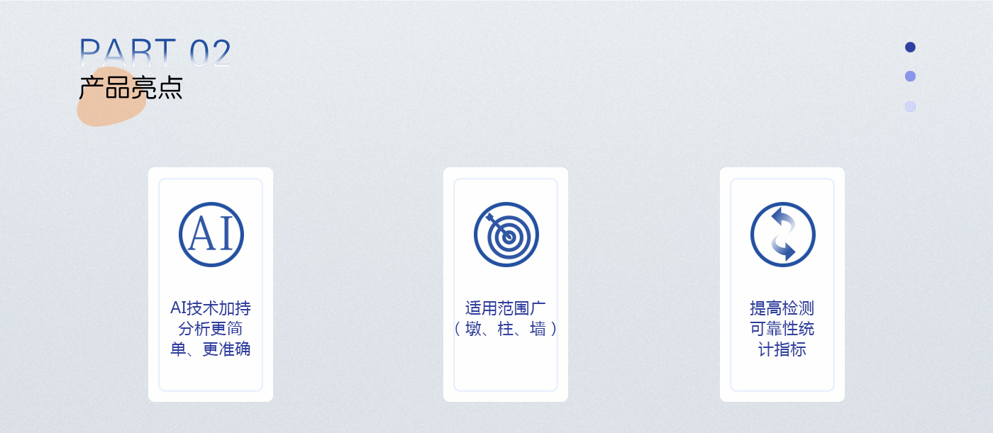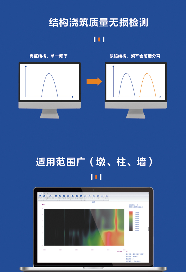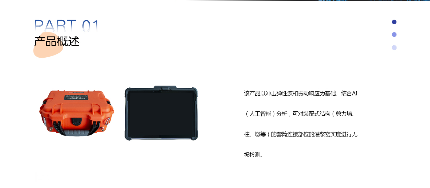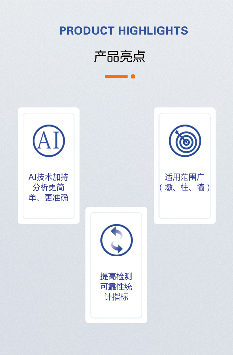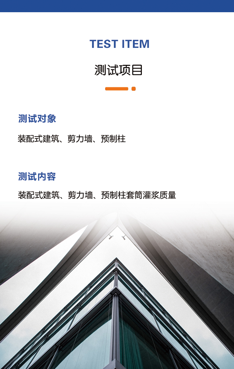 该产品以冲击弹性波和振动响应为基础、结合AI(人工智能)分析,可对装配式结构(剪力墙、柱、墩等)的套筒连接部位的灌浆密实度进行无 损检测。