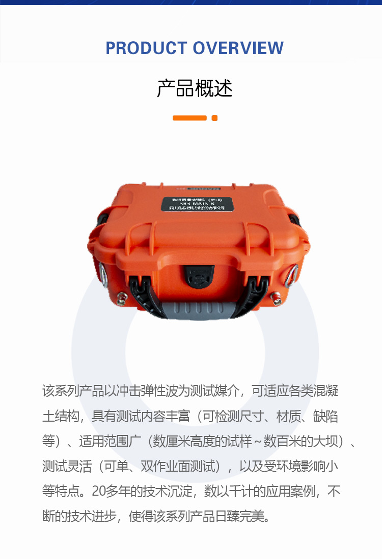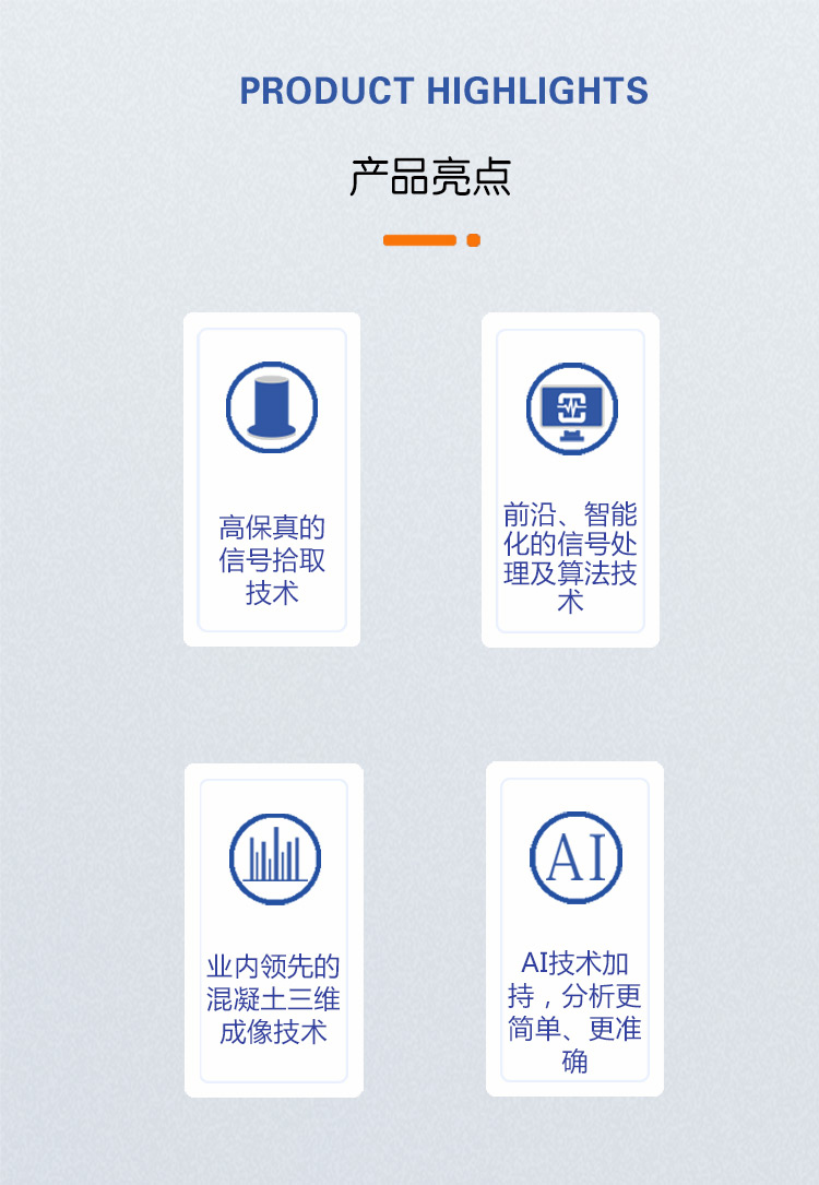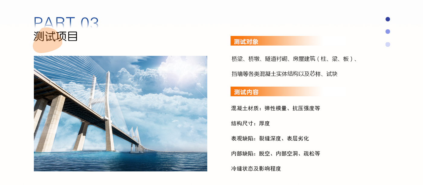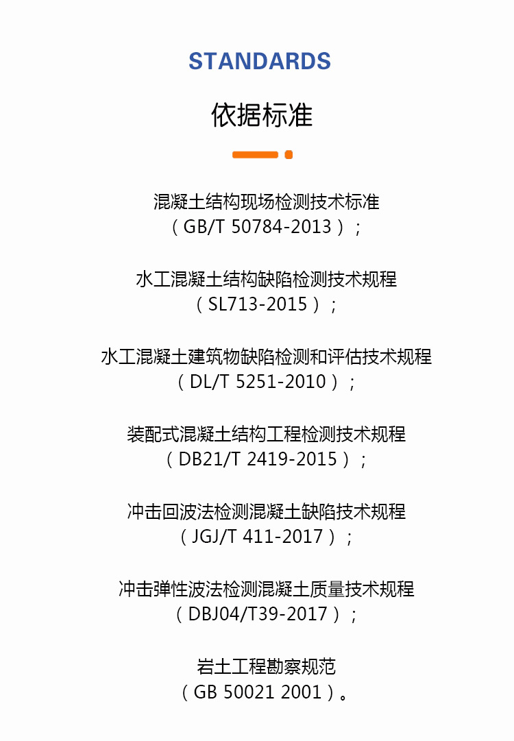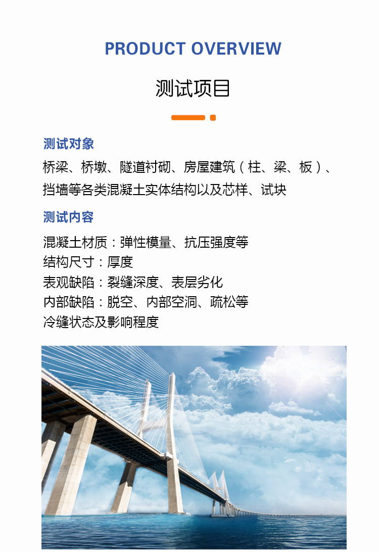 检测对象:桥梁、隧道、大坝、港口等各类混凝土结构 检测内容:混凝土材质:弹性模量、抗压强度等 结构尺寸:厚度 表面缺陷:裂缝深度、表层劣化 内部缺陷:脱空、内部空洞、疏松等