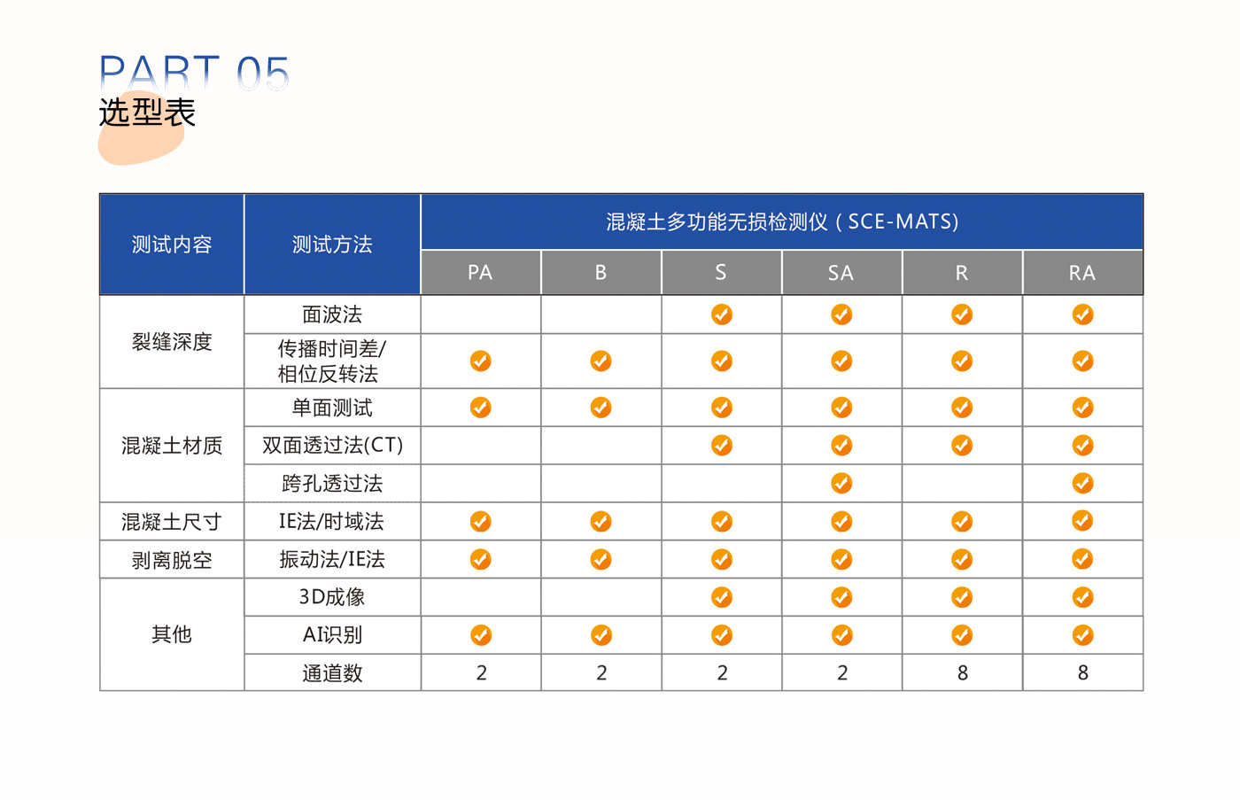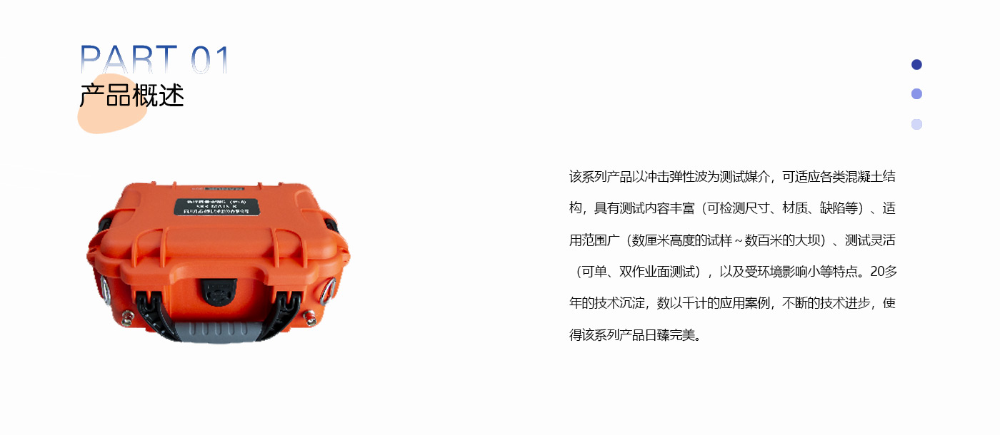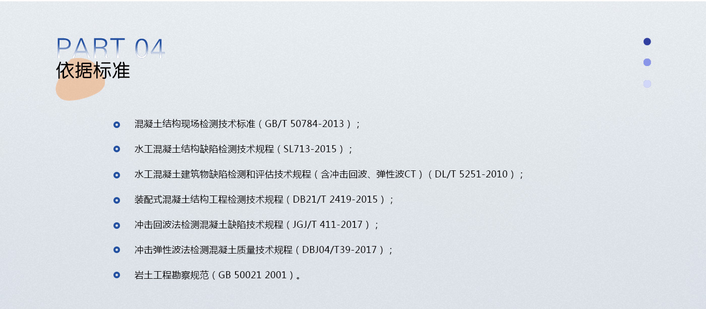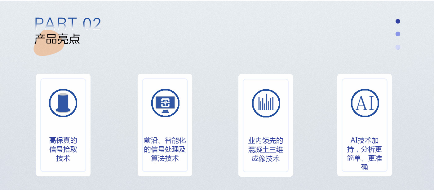 检测对象:桥梁、隧道、大坝、港口等各类混凝土结构 检测内容:混凝土材质:弹性模量、抗压强度等 结构尺寸:厚度 表面缺陷:裂缝深度、表层劣化 内部缺陷:脱空、内部空洞、疏松等