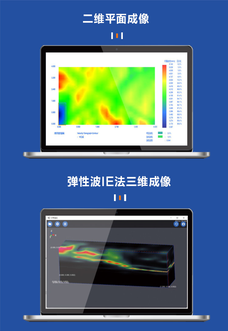 1 功能:仪器功能强大,可对混凝土结构做如下测试:材质模量、厚度、裂缝、表层脱空及内部缺陷